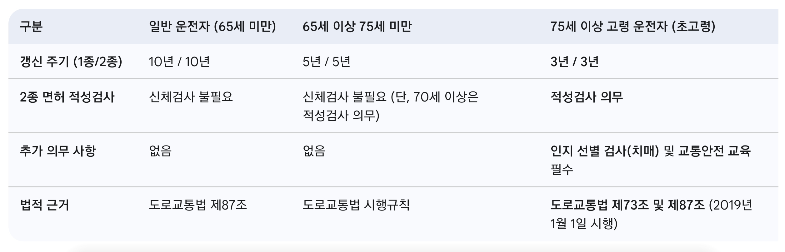 고령 운전자의 연령대별 갱신 제도를 비교하여, 강화된 관리 시스템의 구조를 명확히 이해할 수 있습니다.