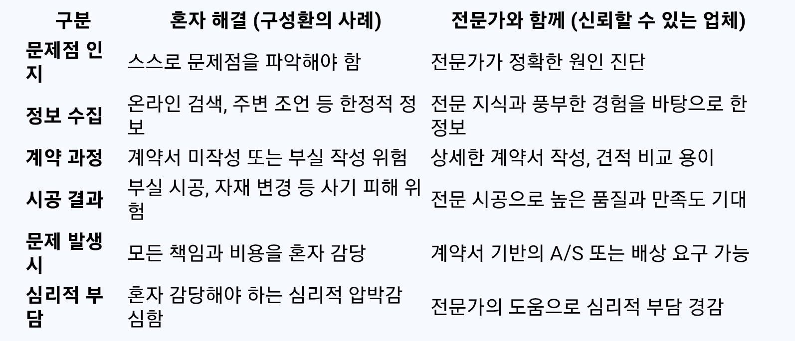 구성환의 사례는 전문가의 도움 없이 혼자 주거 문제를 해결하려 했을 때 발생할 수 있는 위험을 잘 보여줍니다. 아래 표는 전문가의 도움을 받는 경우와 혼자 해결하는 경우의 장단점을 명확하게 비교합니다.