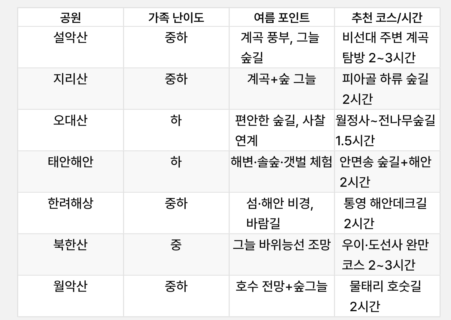 예시: 여름에 가족이 걷기 좋은 대표 국립공원 7