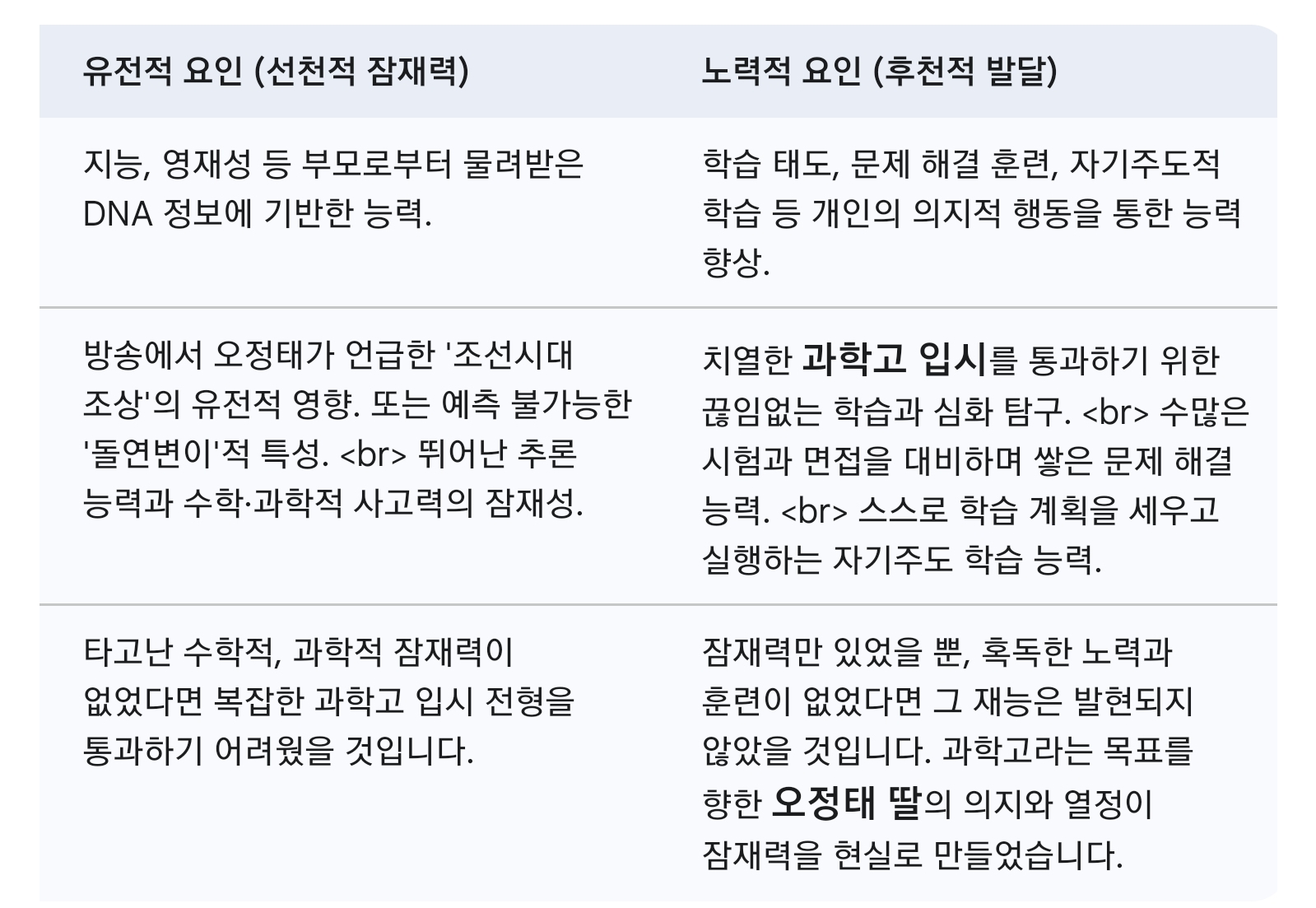 오정태의 딸이 과학고에 합격한 과정은 단순히 '타고났다'거나 '노력만 했다'는 단일한 설명으로는 불충분합니다. 이 사례를 통해 유전적 요인과 노력적 요인이 어떻게 상호 작용하는지 심층적으로 분석할 수 있습니다. 아래 표는 오정태의 딸 사례를 유전과 노력의 시너지 관점에서 해석한 것입니다.