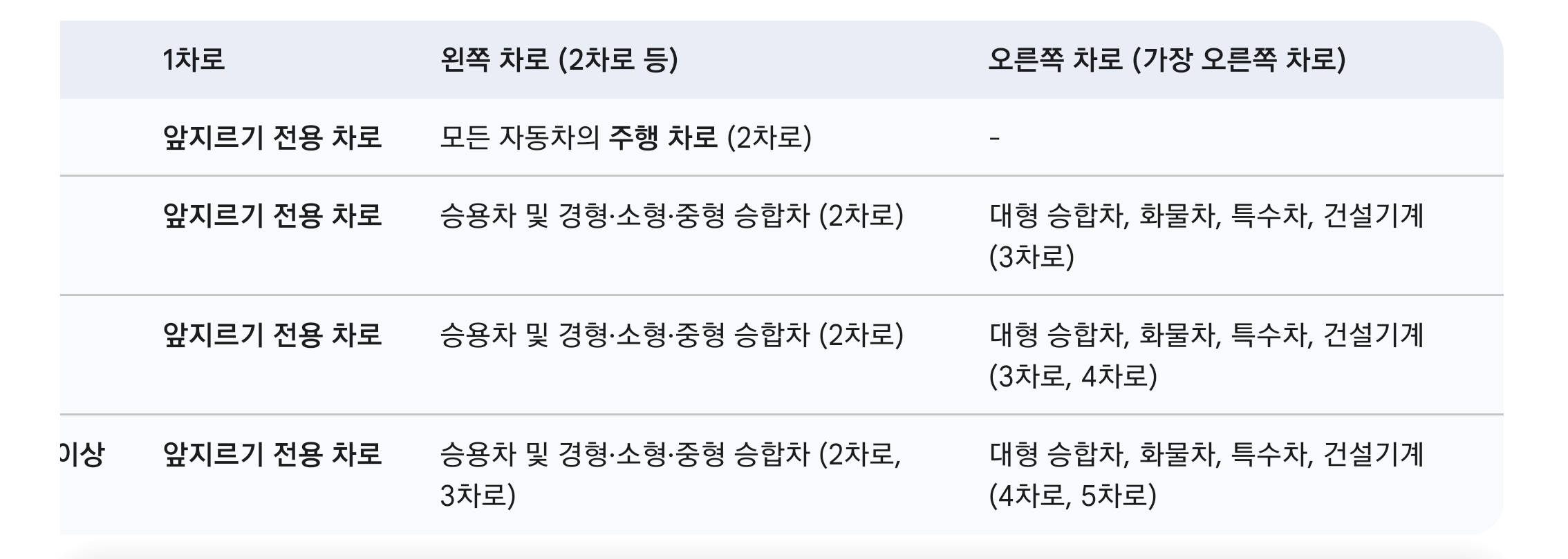 • 2차로의 의미: 편도 3차로 이상 고속도로에서 대형차나 화물차를 운전하는 경우, 2차로는 '왼쪽 차로'이므로 원칙적으로 통행이 불가능함을 명심해야 합니다. 2차로는 승용차의 주행 차로입니다.