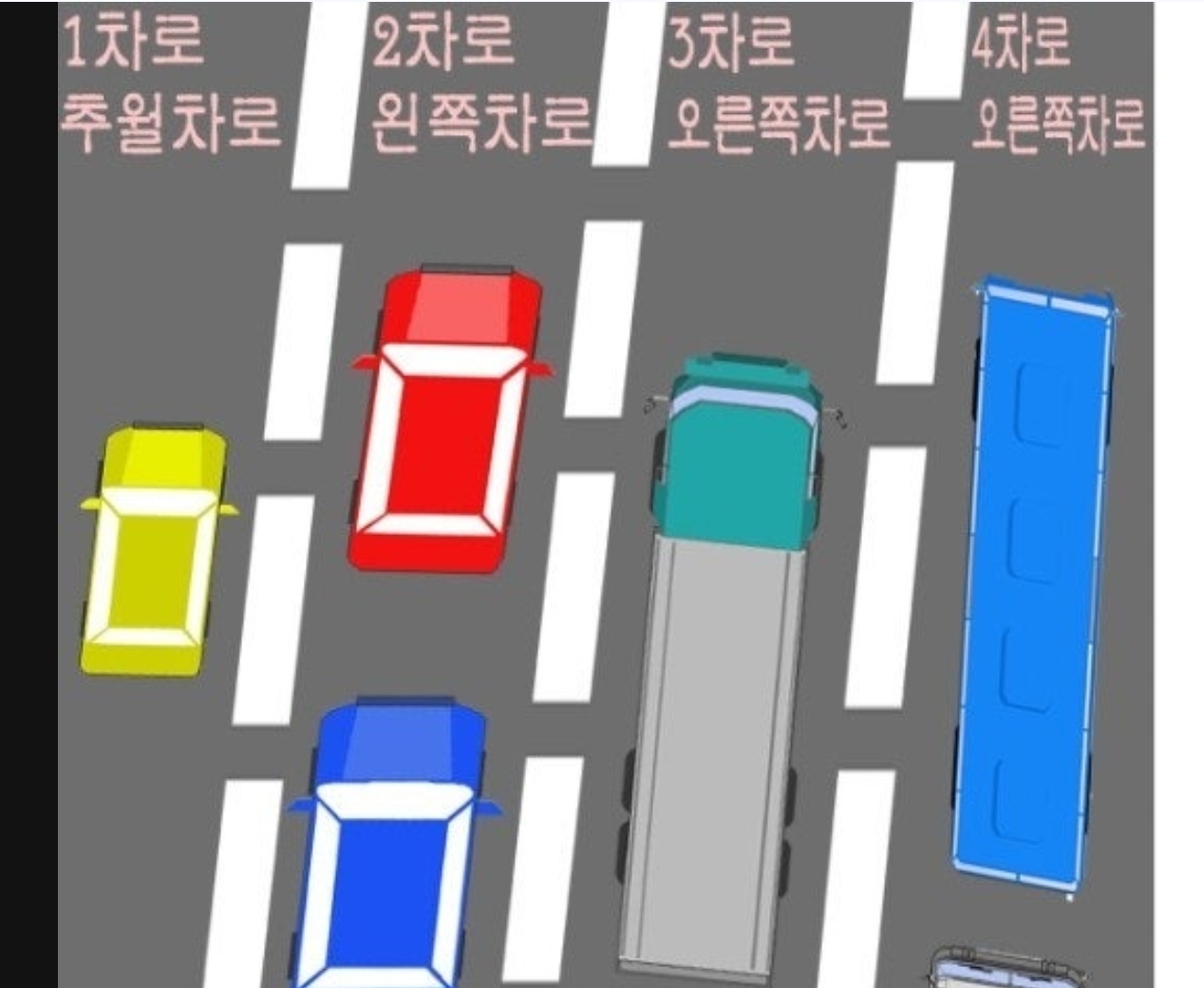 • 대형차 및 화물차 운전자 (지정차로 위반 사례): 대형 승합차(36인승 이상 또는 전장 9m 이상), 화물자동차, 특수자동차, 건설기계 등은 3차로 이하의 '오른쪽 차로'로 통행해야 합니다.