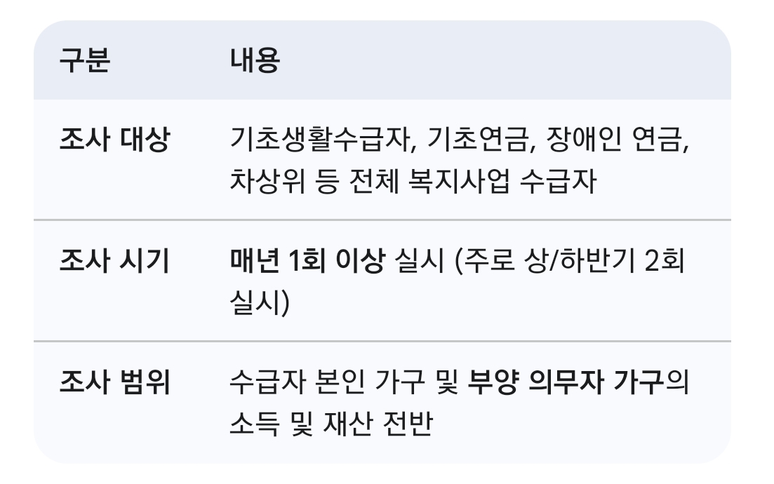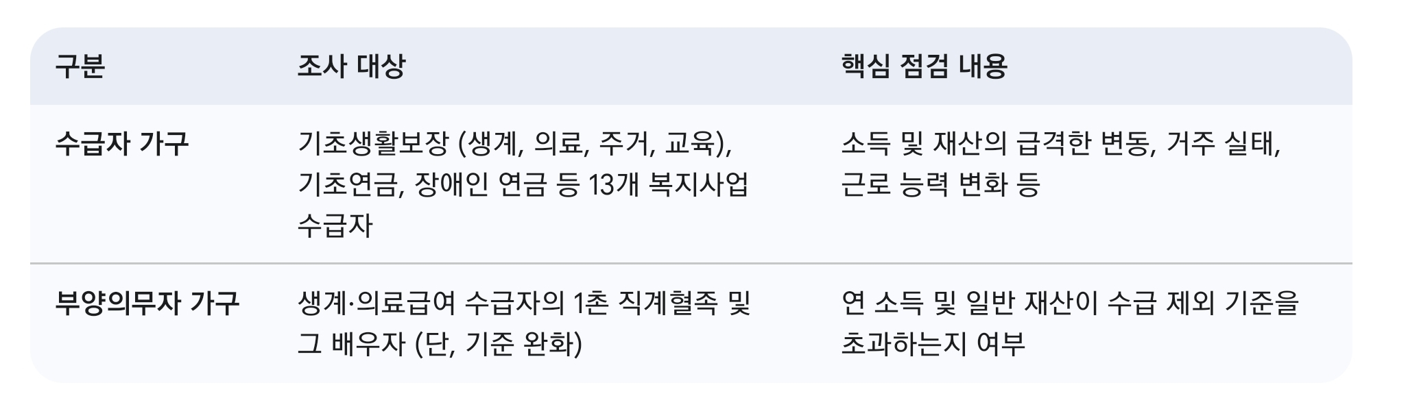 기초생활수급자에 대한 정기 확인 조사는 매년 1회 이상, 주로 상반기와 하반기에 걸쳐 진행됩니다. 이는 단순 서류 확인을 넘어, 사회보장정보시스템(행복 e음)을 통해 140여 개 이상의 금융기관, 공공기관 및 유관 부처의 최신 정보를 연계하여 진행되는 전산화된 전수조사입니다.