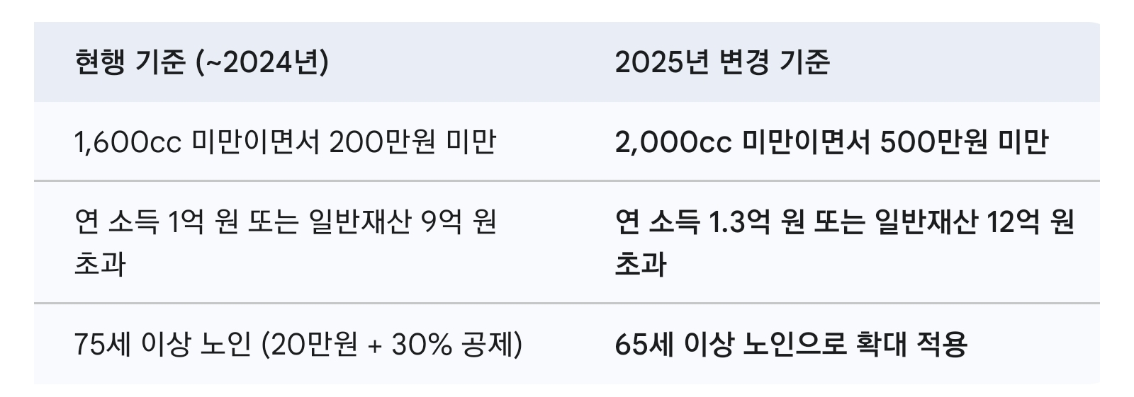 2025년부터는 자동차 보유로 인한 수급 탈락을 최소화하고, 부양의무자 기준을 현실화하기 위해 다음과 같은 기준이 대폭 완화되었습니다.