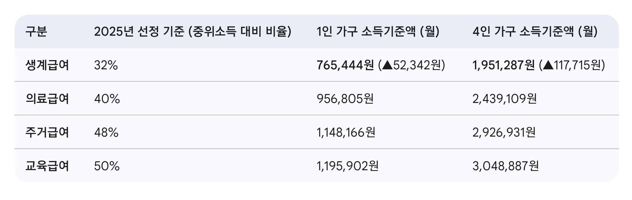 2025년도 기준 중위소득은 6.42% 인상되어, 기초생활보장 급여별 선정 기준액이 크게 상향 조정되었습니다.