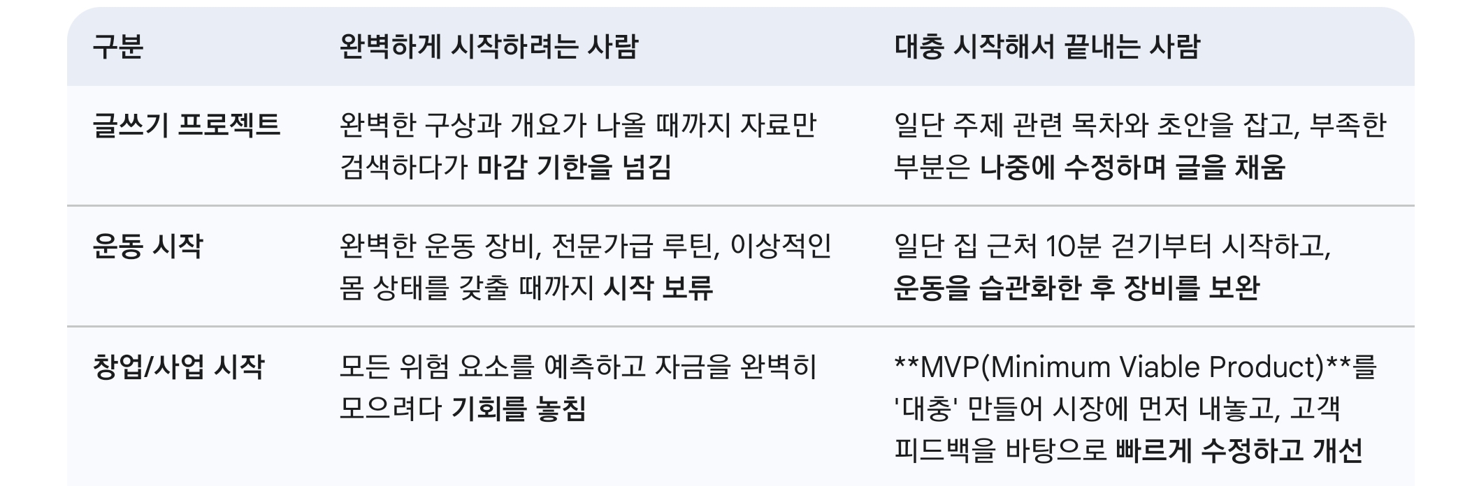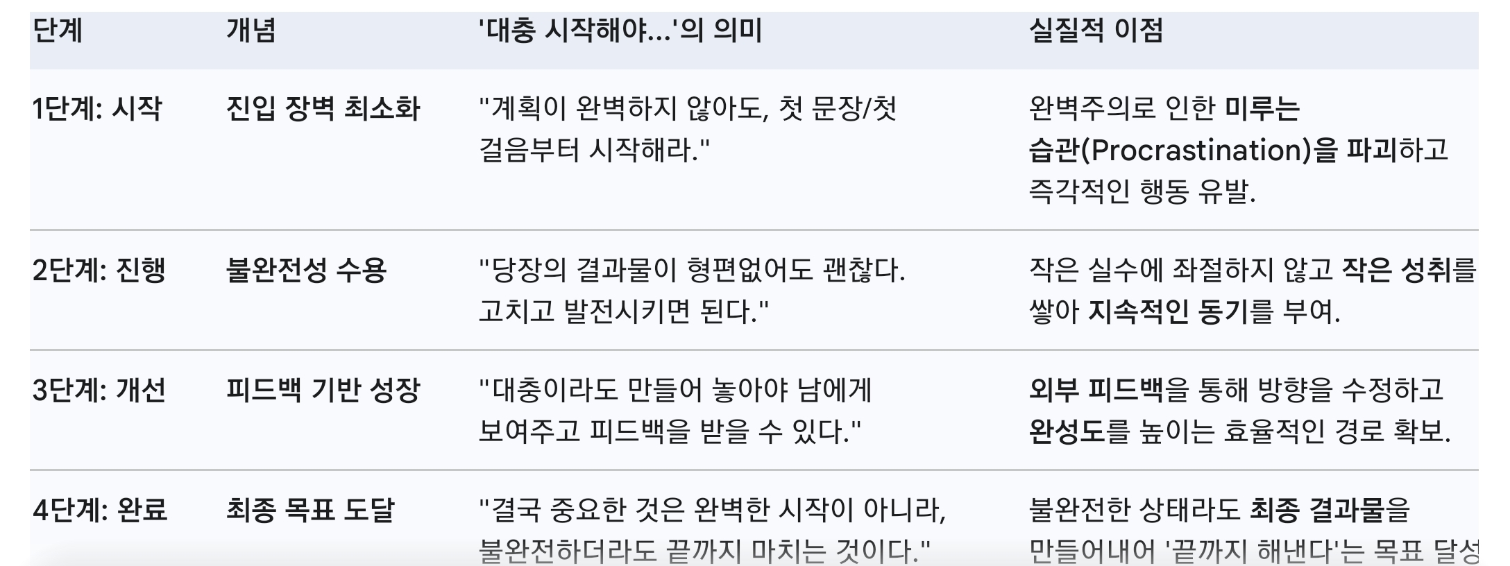 → '대충 시작하라'는 것은 이 높은 '시작의 기준'을 0점으로 낮추어, 부담 없이 첫 발을 내딛게 하는 강력한 해방구가 됩니다.