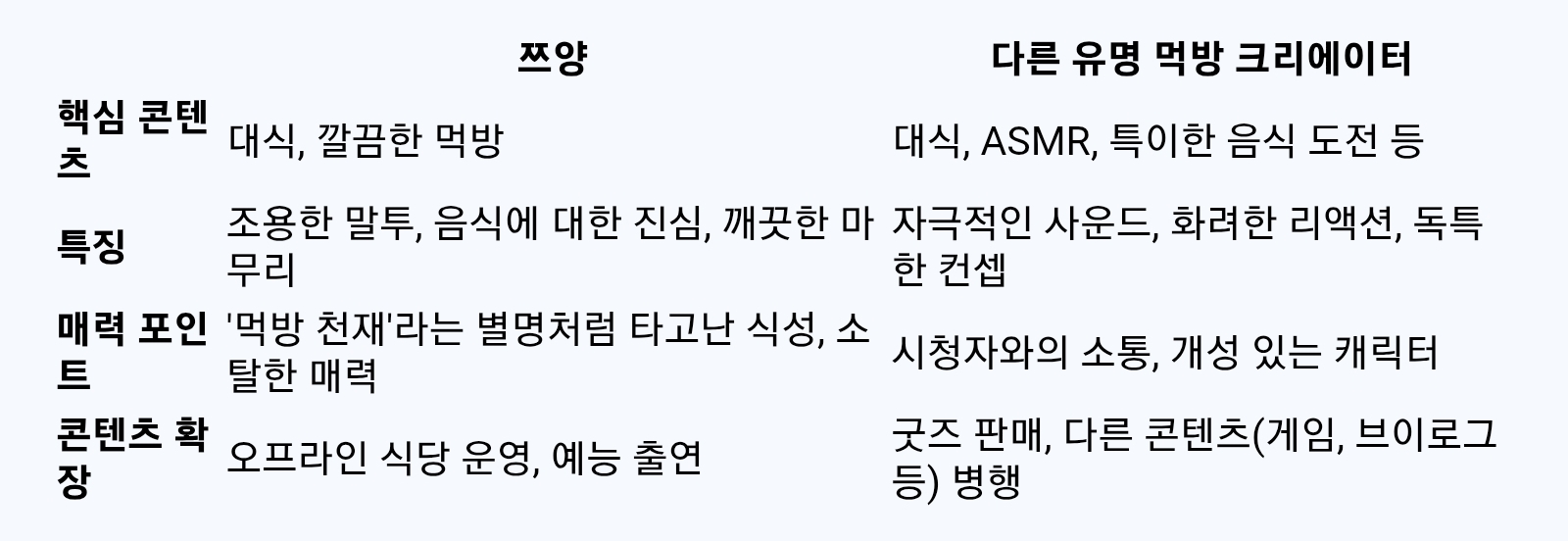 위 비교표에서 볼 수 있듯이, 쯔양은 '대식'이라는 본질에 충실하면서도 '깔끔함'과 '진솔함'이라는 차별점을 내세웠다. 이는 시청자들이 그녀의 먹방을 '편안하고 기분 좋은' 콘텐츠로 인식하게 만드는 요인이다.