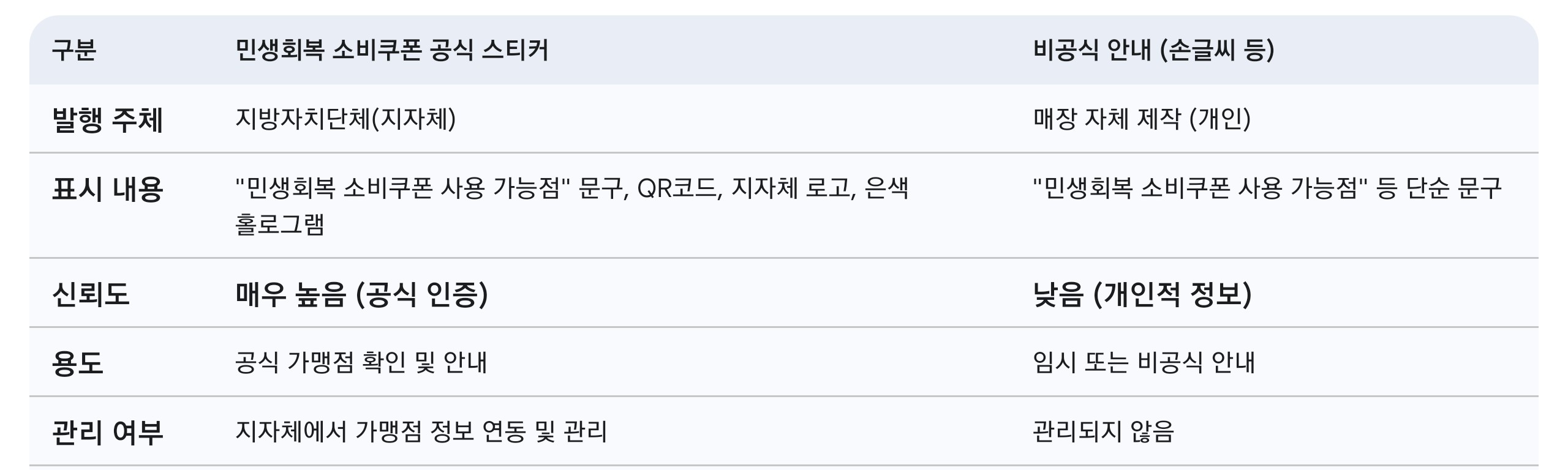 * 공식 스티커의 중요성: 이 스티커는 매장이 민생회복 소비쿠폰 사용 가능점임을 알리는 유일하고 공식적인 표시입니다.