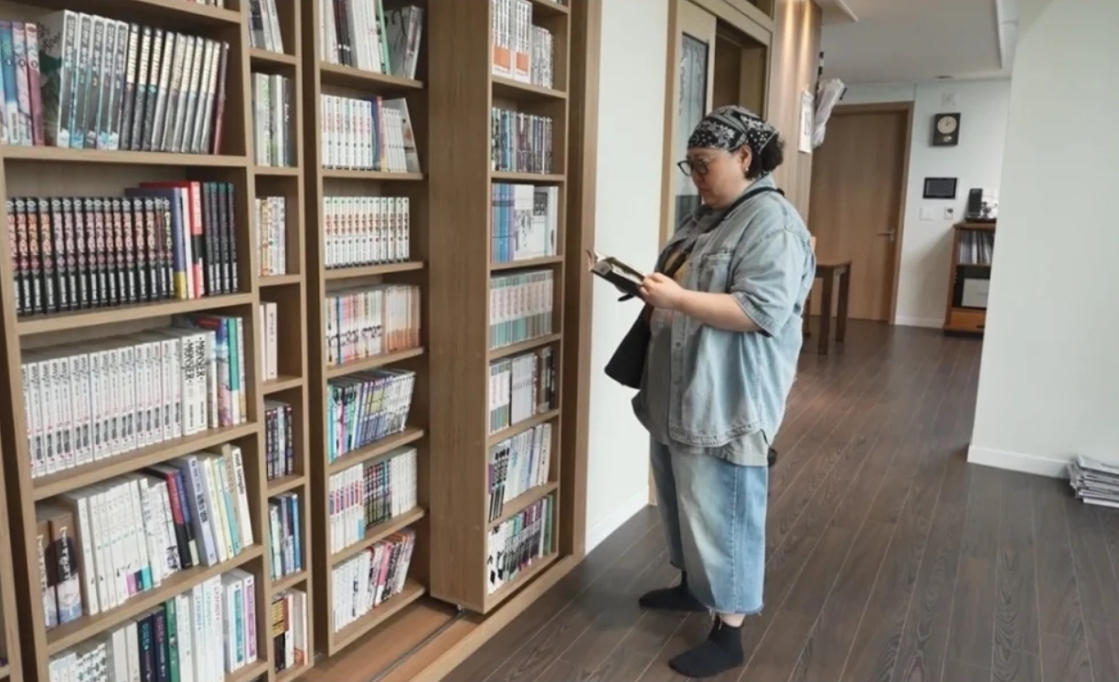 '나'를 위한 공간: 벽 한쪽을 가득 채운 만화책들은 배우이자 소설가 남편의 예술적 감성이 고스란히 담긴 부분입니다. 이는 집이 남에게 보여주기 위한 공간이 아니라, 개인의 취미와 취향을 오롯이 담아내는 사적인 공간이어야 한다는 철학을 보여줍니다. 책장 하나만으로도 부부의 자유롭고 창의적인 에너지가 느껴집니다.