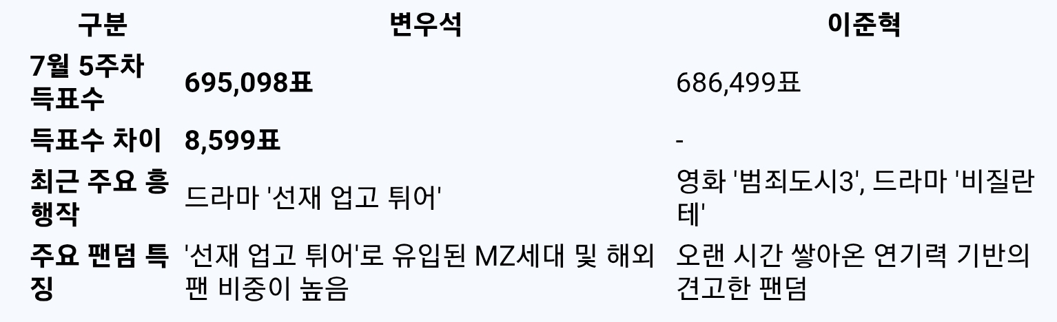 변우석의 이번 1위 등극이 더욱 의미 있는 것은, 막강한 팬덤을 자랑하는 배우 이준혁과의 치열한 경쟁 끝에 이뤄낸 결과이기 때문입니다. 두 배우의 팬덤 경쟁 양상을 통해 최근 스타 팬덤 문화의 특징을 엿볼 수 있습니다.