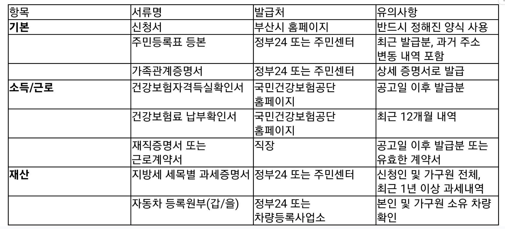 * 거주지: 공고일 기준 주민등록상 주소지가 부산광역시로 되어 있어야 합니다. 신청 기간 동안 전입/전출 등 주소지 변동이 없어야 함을 의미합니다.