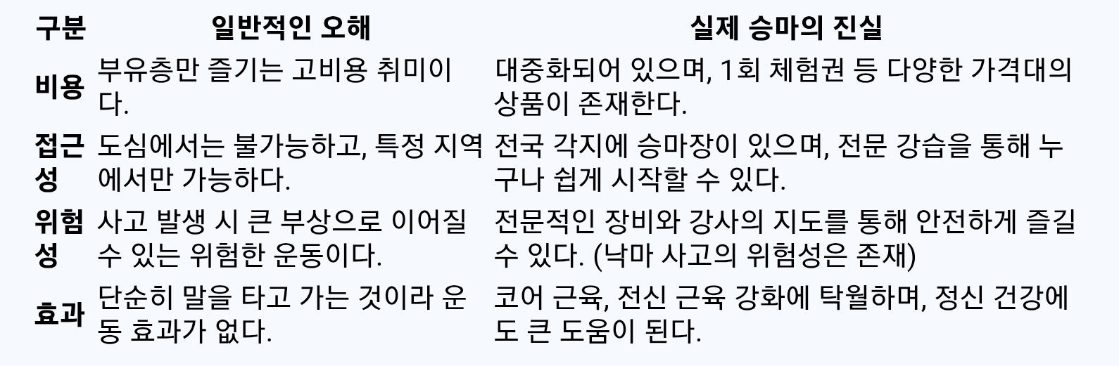 승마에 대한 오해와 진실 비교분석표