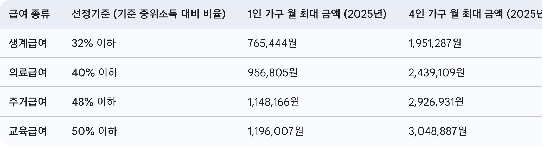 수급자는 소득인정액이 아래 표에 제시된 기준 중위소득의 비율 이하일 때 해당 급여를 받을 수 있습니다. 생계급여 기준은 곧 해당 급여를 받을 수 있는 최대 금액이 됩니다.