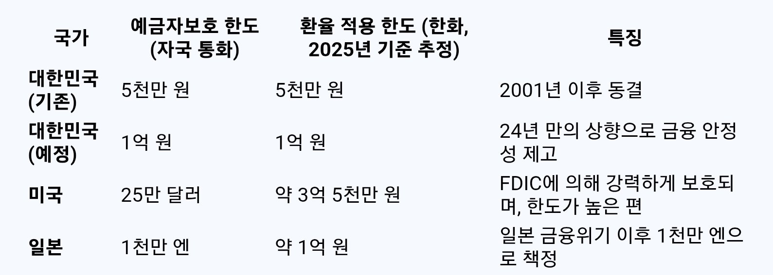 예금자보호 한도는 각국의 경제 규모와 정책 방향에 따라 다르게 설정됩니다. 한국의 예금자보호제도와 주요 선진국들의 제도를 비교해 보면, 이번 한도 상향이 가지는 의미를 더욱 명확히 알 수 있습니다.