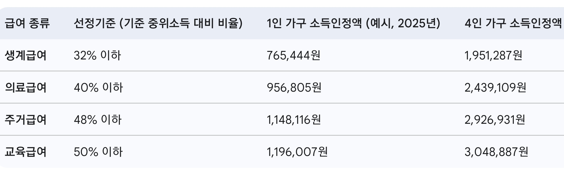 소득인정액 기준 (2025년 기준 중위소득 대비)
