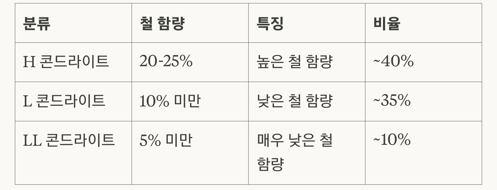 L형 일반 콘드라이트는 모든 운석 중 약 35%를 차지하는 두 번째로 흔한 그룹으로, 철 함량이 상대적으로 낮습니다(10% 미만). 이들은 H 콘드라이트(철 함량 20-25%)와 비교했을 때 현저히 낮은 철 농도를 보입니다.