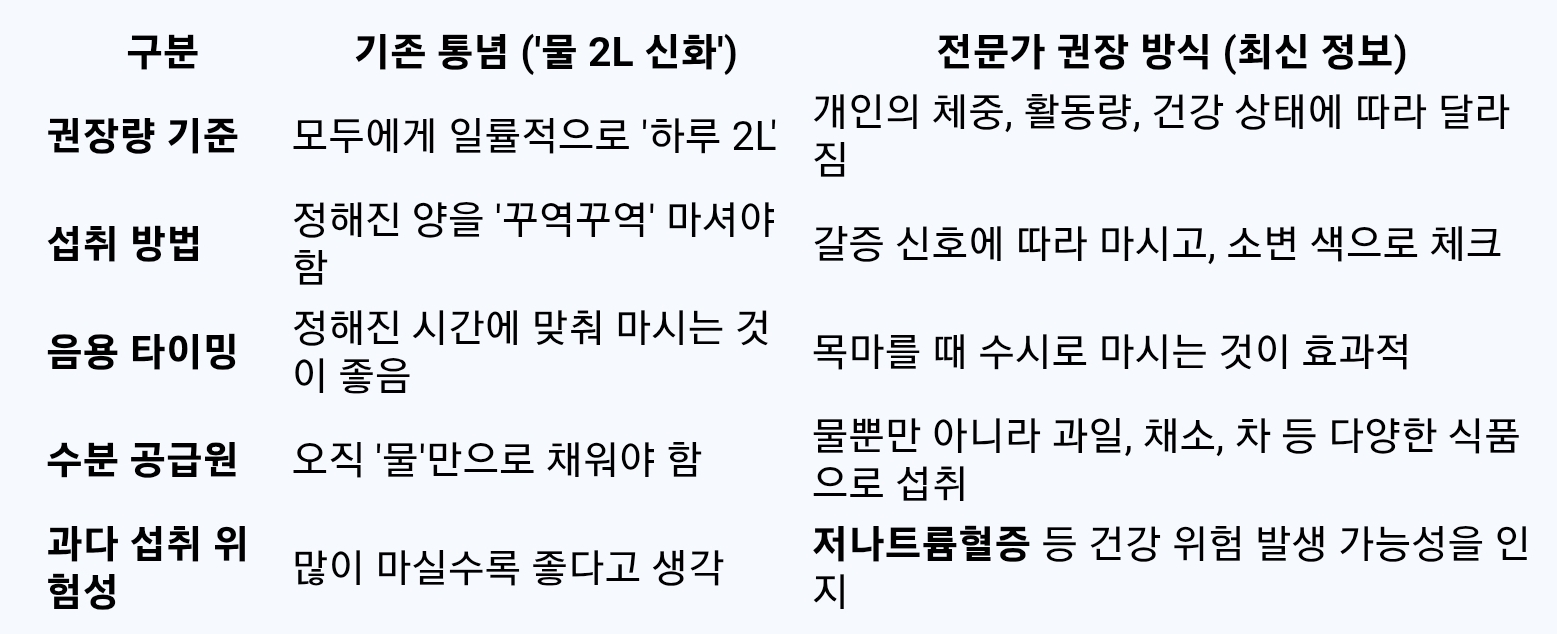 비교 분석표: '물 2L 신화'와 전문가 권장 방식