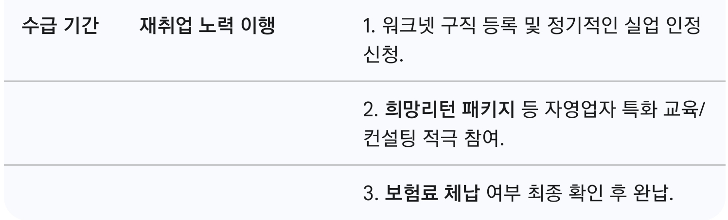 자영업자의 경우, 일반적인 구직 활동 외에도 '희망리턴 패키지' 등의 재창업 관련 컨설팅이나 직업능력개발 훈련에 참여하는 것이 재취업 노력을 입증하는 효과적인 방법입니다. 이러한 훈련이나 컨설팅 참여 내역도 구직 활동으로 인정받을 수 있습니다.