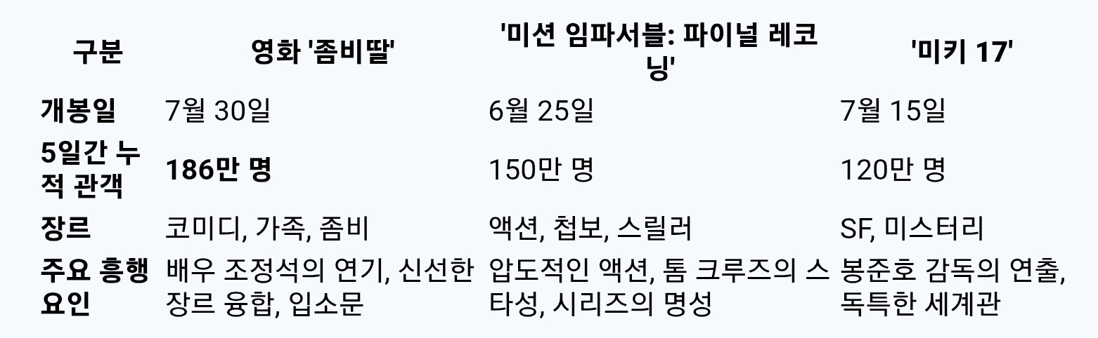 올해 극장가를 뜨겁게 달구었던 주요 개봉작들과 '좀비딸'의 흥행 지표를 비교하여 그 성과를 더욱 명확하게 살펴보겠습니다.
