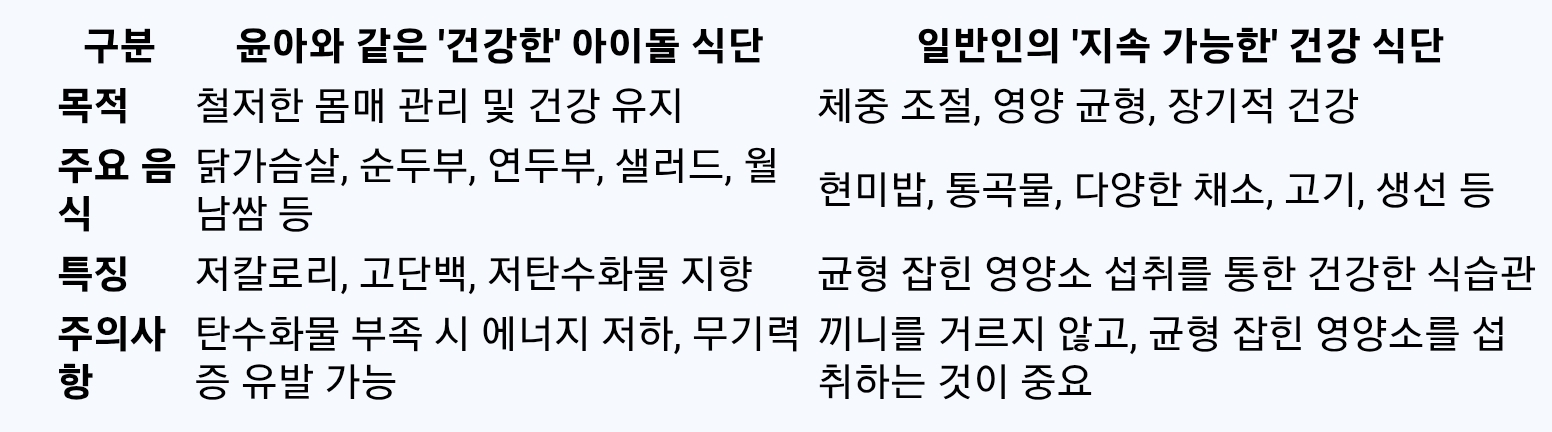 아이돌의 극단적인 식단은 일반인에게 무리가 될 수 있습니다. 윤아의 식단은 비교적 건강한 편이지만, 일반인들이 참고할 때도 자신에게 맞는 방식을 찾아 적용하는 것이 중요합니다.