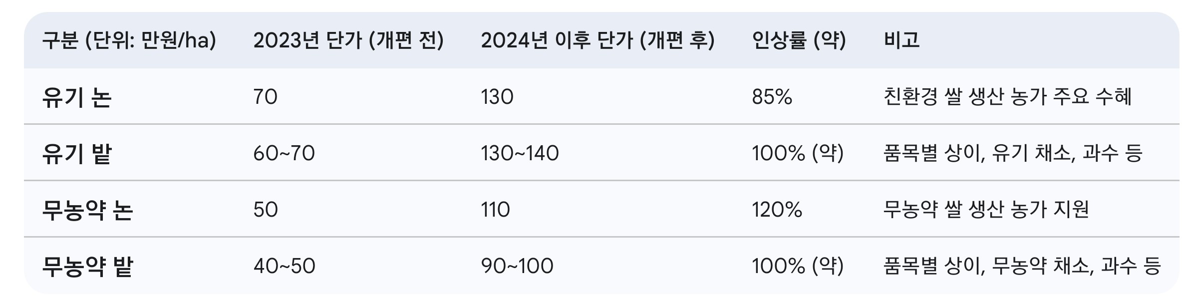 다음 표는 친환경농업직불금 단가가 어떻게 변화했는지 한눈에 비교할 수 있도록 보여줍니다. (2023년 대비 2024년 인상 기준으로, 2025년에도 동일 기조 유지 또는 추가 검토 중)