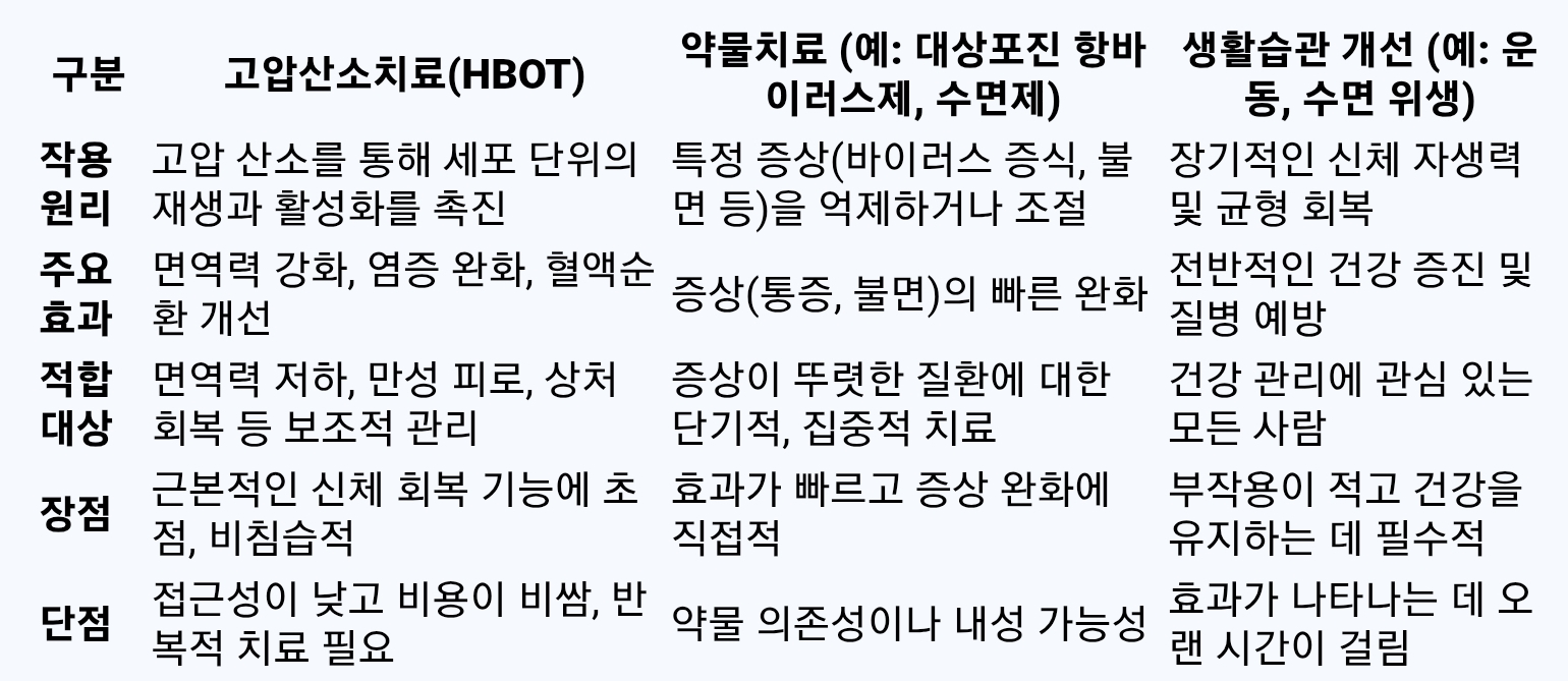고압산소치료는 기존의 치료법과 어떤 차이가 있을까요? 아래 표를 통해 그 특징을 한눈에 비교해 보세요.