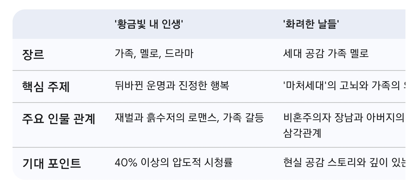 '황금빛 내 인생'이 재벌가와 흙수저의 뒤바뀐 인생을 통해 가족의 의미를 탐구했다면, '화려한 날들'은 "인간은 누구에게나 화려한 날들이 있다. 지금이든, 과거에서든, 앞으로든"이라는 메시지를 중심으로 세대 공감 가족 멜로를 표방한다. 이는 단순히 성공 공식에 안주하지 않고, 현대 사회의 다양한 가족 형태와 개인의 삶을 깊이 있게 조명하겠다는 제작진의 의지를 엿볼 수 있는 대목이다. 특히, '화려한 날들'은 '마처세대'라는 신조어를 통해 부모를 부양하는 마지막 세대이자 자식에게 부양받지 못하는 첫 세대의 고뇌를 현실적으로 담아낼 예정이다. 이는 시청자들에게 깊은 공감과 함께 진정한 가족의 의미를 되새기는 기회를 제공할 것으로 보인다.