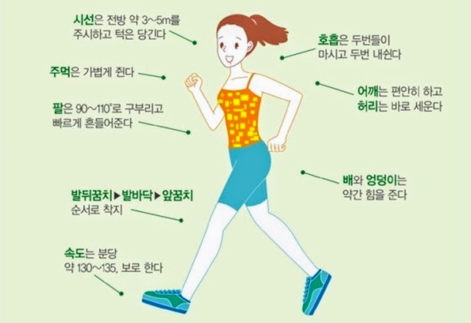 • 발 동작: 발뒤꿈치부터 땅에 닿게 하고, 발바닥 전체로 체중을 이동시킨 후