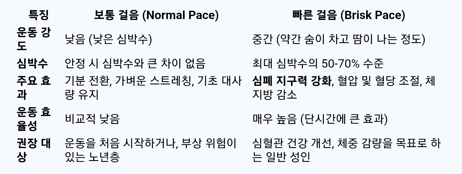 걷기 운동의 효과를 제대로 누리기 위해서는 '어떻게 걷는가'가 중요합니다. 단순히 걸음 수만 채우는 것과 빠른 걸음을 통해 운동 강도를 높이는 것 사이에는 큰 차이가 있습니다. 아래 표는 두 가지 걷기 방법의 특징을 비교 분석한 것입니다.