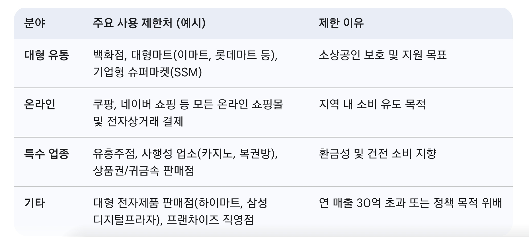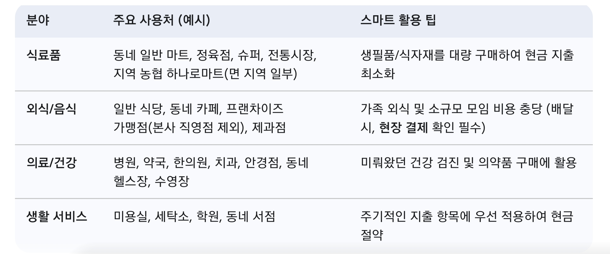 소상공인: 주소지 내 연 매출 30억 이하의 동네 마트, 식당, 병원 등 소상공인 업소에서만 사용 가능합니다. 대형마트, 백화점, 온라인 쇼핑몰은 사용 불가입니다.
