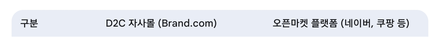 비교 분석 위 표에서 볼 수 있듯이, D2C 자사몰은 수익성과 브랜드 통제력, 그리고 데이터 확보 측면에서 압도적인 강점을 가집니다. 반면, 오픈마켓 플랫폼은 방대한 고객 트래픽을 기반으로 초기 진입 장벽을 낮추고, 물류 및 결제 시스템을 쉽게 활용할 수 있다는 장점이 있습니다. 이처럼 두 채널은 서로 다른 강점을 가지고 있으며, 성공적인 이커머스 전략은 이 두 채널을 상호 보완적으로 활용하는 데 있습니다.